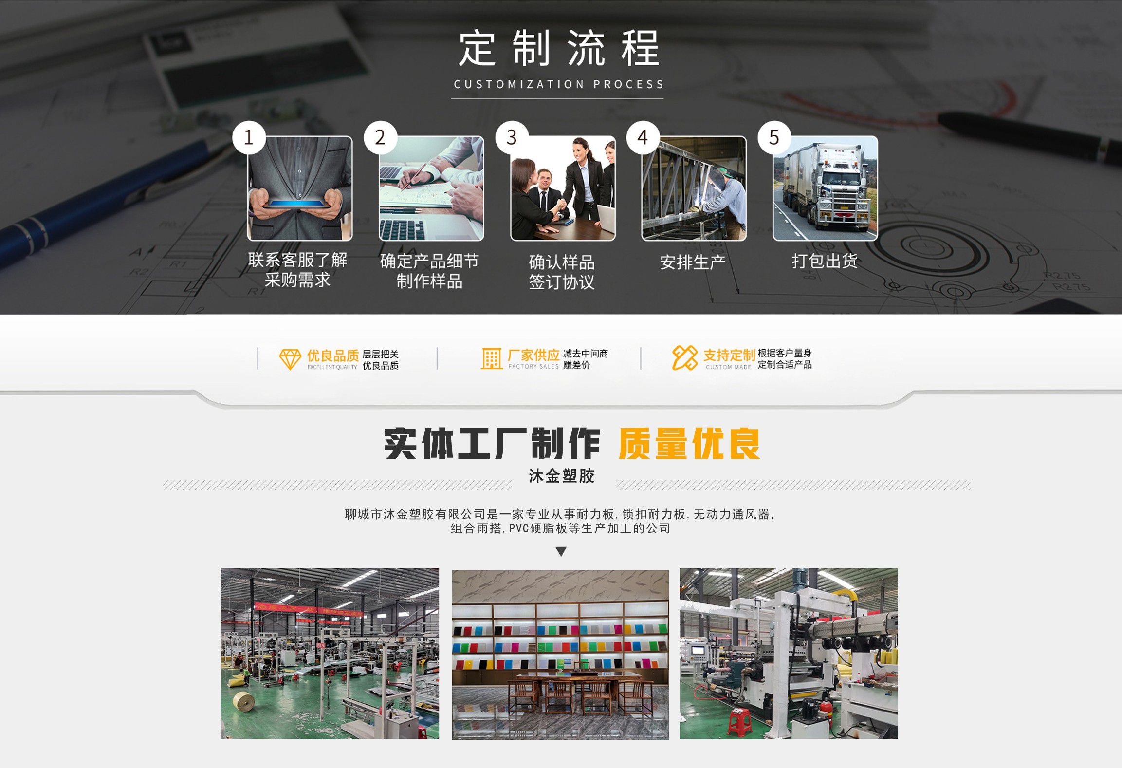 聊城市沐金塑膠有限公司注冊(cè)資金2180萬(wàn)元,占地20000余平方,擁有自建廠(chǎng)房15000平方,員工100余名。10余年來(lái),公司主營(yíng)耐力板,鎖扣耐力板,耐力板深加工,無(wú)動(dòng)力通風(fēng)器,組合雨搭,PVC硬脂板,耐力板廠(chǎng)家等板材的發(fā)展戰(zhàn)略,逐漸成長(zhǎng)為綜合性企業(yè)。 公司擁有多條板材共擠生產(chǎn)線(xiàn),采用世界知名品牌進(jìn)口原材料和先進(jìn)工藝,依據(jù)完善的ISO9001質(zhì)量管理體系和ISO14001環(huán)境管理體系,為產(chǎn)品的卓越品質(zhì)提供了強(qiáng)有力的保證。憑借過(guò)硬的創(chuàng)新能力和堅(jiān)實(shí)的硬件基礎(chǔ),贏創(chuàng)已成為國(guó)內(nèi)領(lǐng)先的熱塑性板材生產(chǎn)商,產(chǎn)品被廣泛應(yīng)用于建筑業(yè)、農(nóng)業(yè)、工業(yè)、廣告業(yè)、安防行業(yè)及DIY領(lǐng)域。 公司始終致力于通過(guò)提供最優(yōu)的板材應(yīng)用解決方案,為客戶(hù)創(chuàng)造最高的價(jià)值;堅(jiān)守創(chuàng)新、質(zhì)量、靈活、服務(wù)和速度的核心價(jià)值觀(guān);堅(jiān)持“完美的產(chǎn)品需要完美服務(wù)的支持”的經(jīng)營(yíng)理念,努力實(shí)現(xiàn)成為世界領(lǐng)先的板材與解決方案供應(yīng)商的夢(mèng)想?! ≡谖磥?lái),公司將立足客戶(hù)需求,不斷改變和完善現(xiàn)有產(chǎn)品,拓展產(chǎn)品線(xiàn)和充分開(kāi)發(fā)板材的應(yīng)用領(lǐng)域,為客戶(hù)創(chuàng)造全方位的價(jià)值。同時(shí)更好地實(shí)現(xiàn)員工的價(jià)值,實(shí)現(xiàn)公司團(tuán)隊(duì)的價(jià)值。我們將與您一起創(chuàng)贏未來(lái)! 企業(yè)使命:成為世界領(lǐng)先的板材與解決方案供應(yīng)商?! 」驹妇埃和ㄟ^(guò)提供最優(yōu)的板材應(yīng)用解決方案,為客戶(hù)創(chuàng)造最高的價(jià)值?! 『诵膬r(jià)值觀(guān):質(zhì)量...